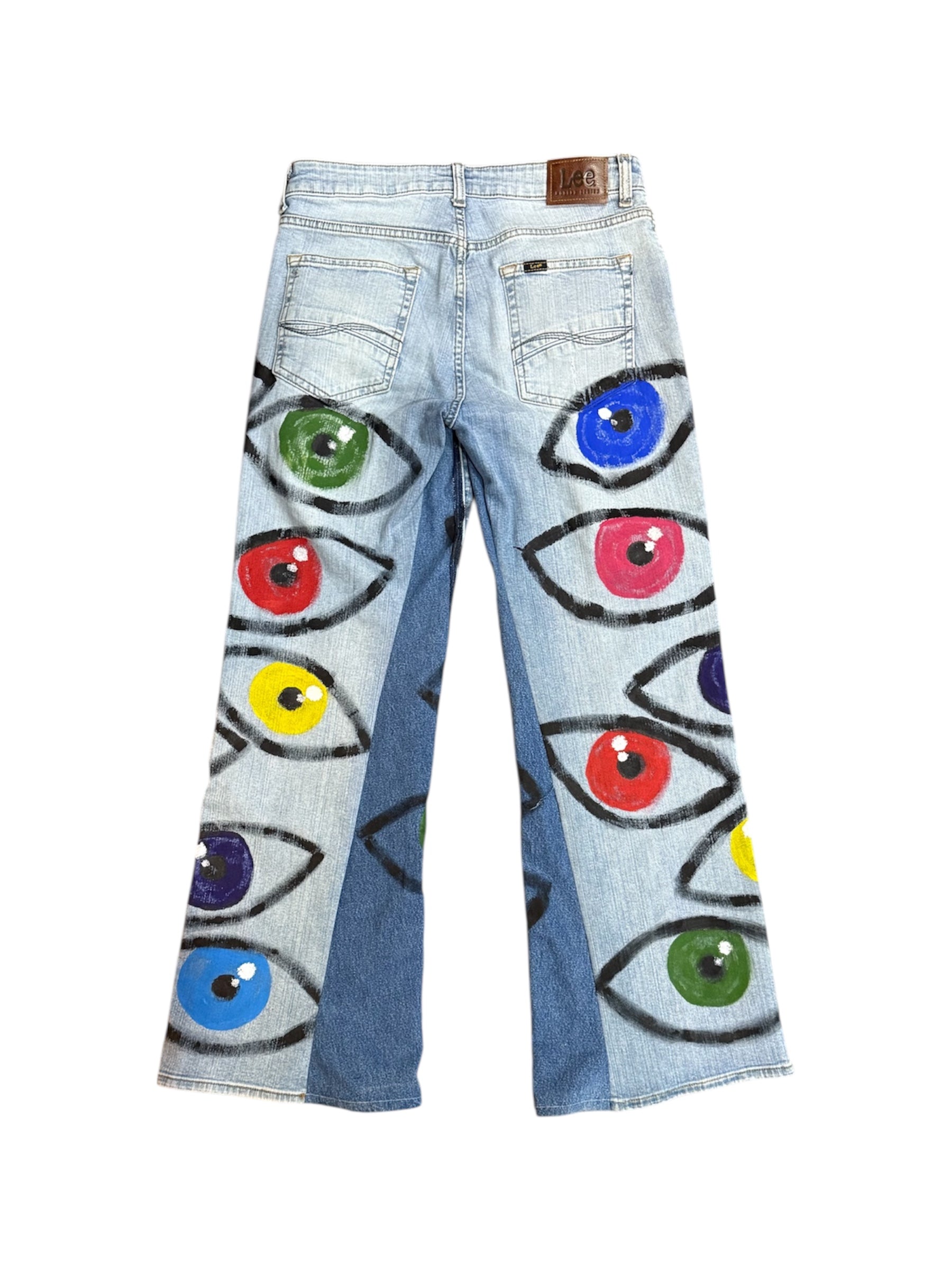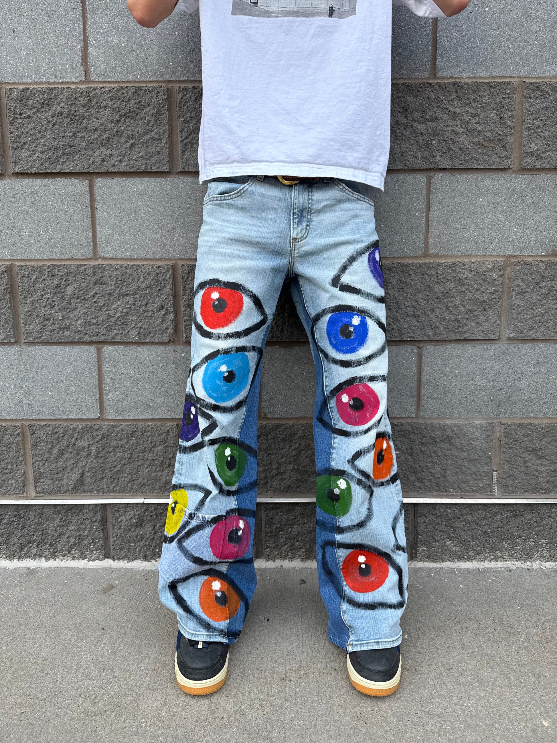 32W x 32L flared jeans with 12in leg opening and painted eyeball designs.