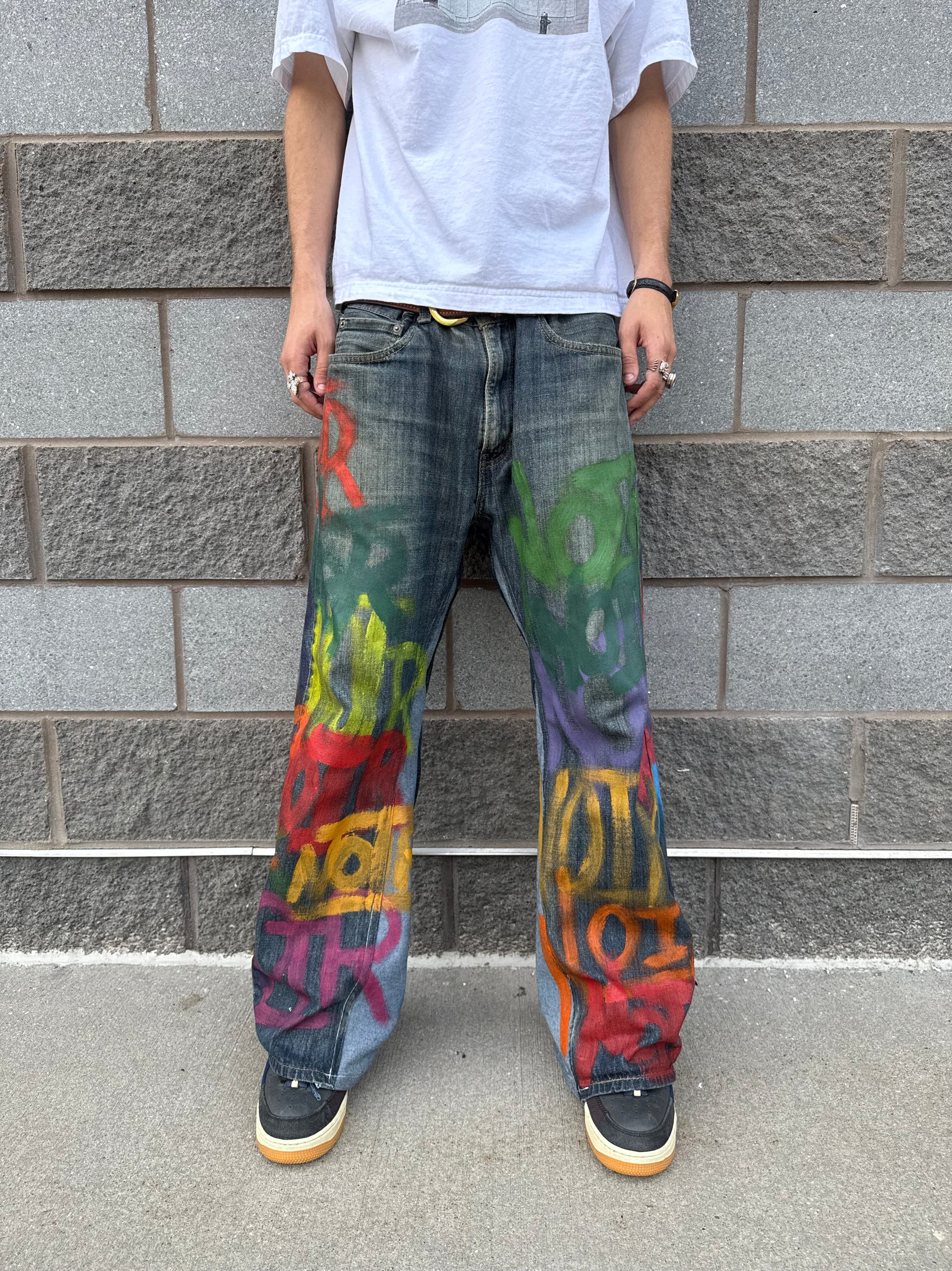 34W x 31L flared jeans with painted graffiti designs and 12in leg opening.